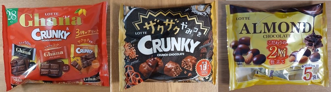 ロッテのチョコレート大袋3種「ガーナ&クランキーシェアパック」「ザクザクやみつきクランキーシェアパック」「アーモンドチョコレートシェアパック」